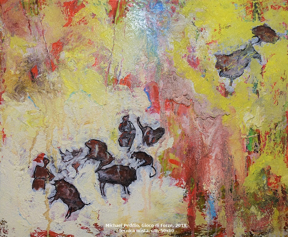 Di colori luminosi ed accesi si avvale, invece, Michael Peddio che, attraverso una pittura densa e stratificata, fa emergere i profili di animali preistorici. La memoria corre, allora, al fascino immortale delle pitture rupestri, dalle grotte di Lascaux alle rocce di Tassili-n-Ajjer, nel Sahara centrale.