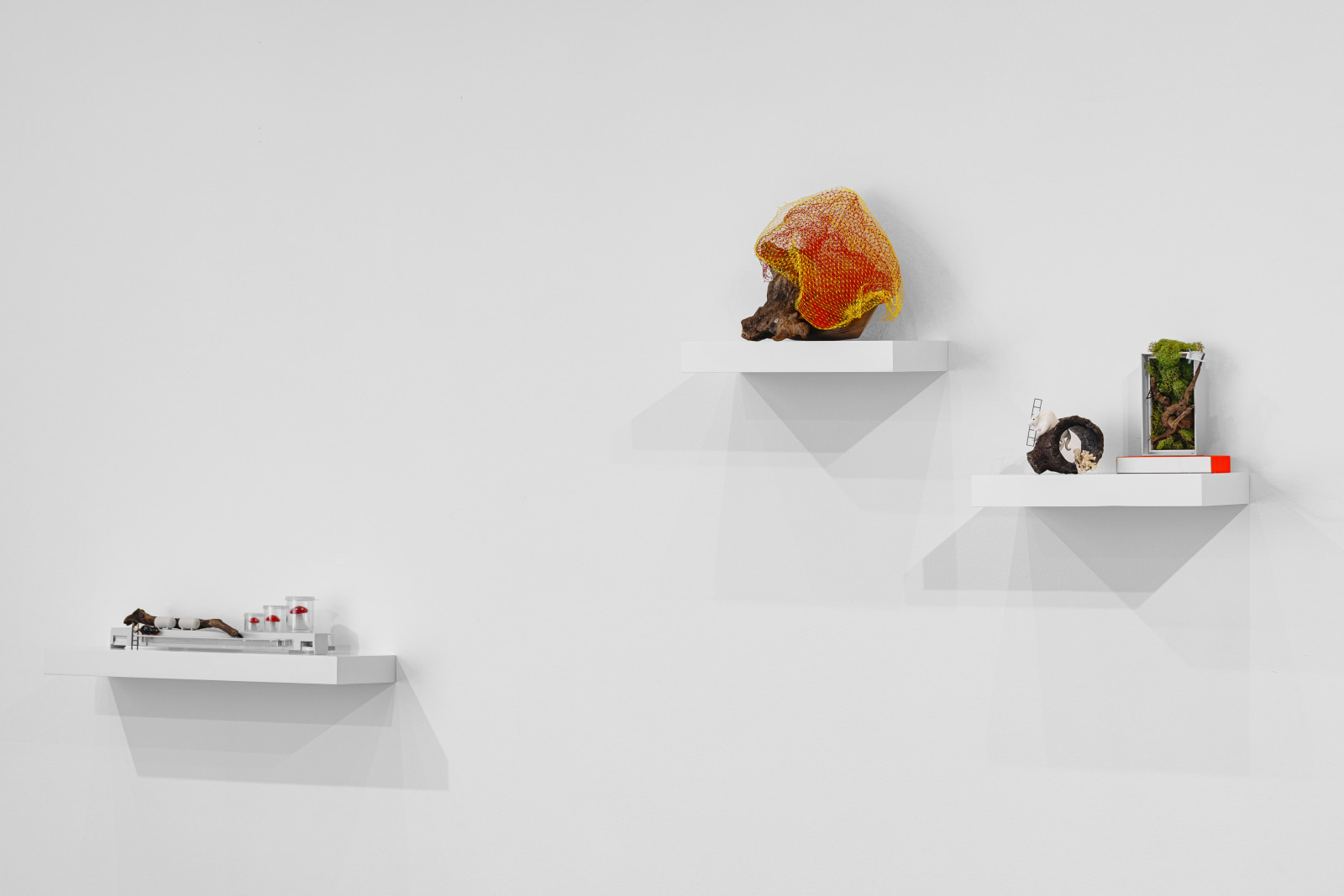 the world through my mother's cabinets of curiosities (2025), a mixed media installation composed of delicate miniature objects utilizing miniature plants, flowers, and knickknacks Chung’s mother collected over the years; dead corals that Chung picked up while researching in Ishigaki, Okinawa; leftover materials from her previous projects; rocks, driftwoods, and random things donated by friends and family. Chung’s whimsical mini sculptures humorously depict the ways in which objects we have accumulated reflect who we are. At the same time, the artworks bring new meanings to these objects embedded with personal histories by delineating our impact on the environment; our experience of disasters, migration and survival; the rebound and taking over of nature in the aftermath. Together with Chung’s ongoing works tracing earth’s deep time, prehistoric Neolithic monumental earthworks, and the ancient spice trade,