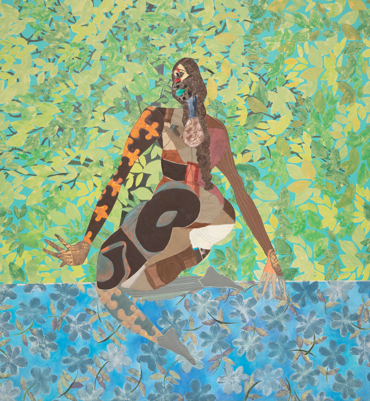 Tschabalala Self Bayou Bather, 2025 Fabric, thread, painted canvas, colored pencil, acrylic, oil and ink on canvas 259.1 x 243.8 x 3.8 cm 102 x 96 x 1 1/2 in